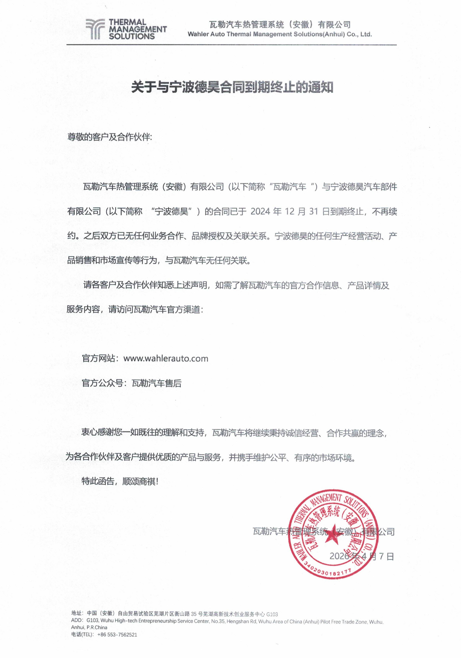 关于与宁波德昊合同到期终止的声明